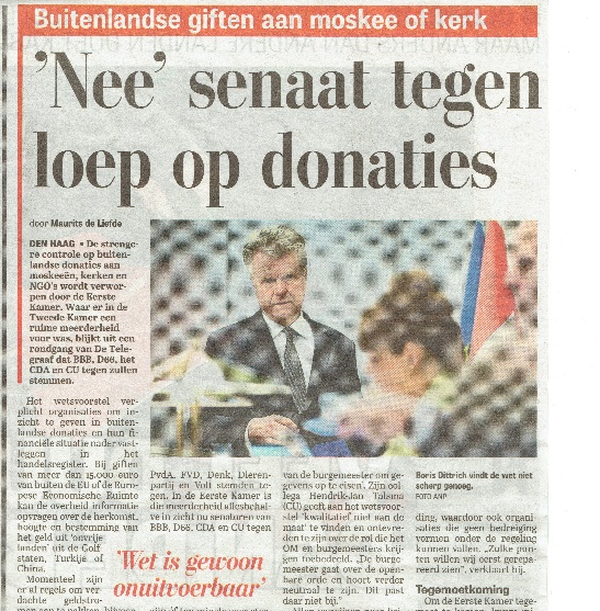 Het wetsvoorstel dat tot doel had om buitenlandse financiering van moskeeën en maatschappelijke organisaties in Nederland strenger te controleren en dat al ongeveer vijf jaar onderwerp van debat was, heeft de Senaat niet gehaald. De regeling, die eerder door de Tweede Kamer was aangenomen, kreeg ditmaal onvoldoende steun en werd verworpen.