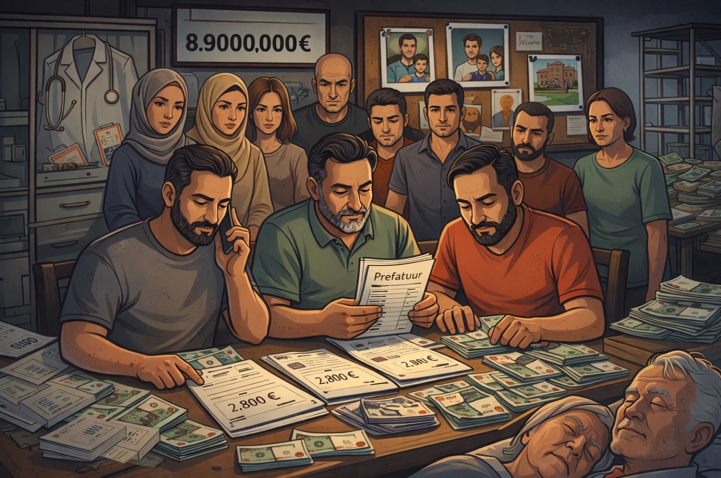 In bovenstaande representatieve afbeelding valt een structuur op die zich rond een Turkse familie vormt. Met dossiers, berekeningen en geldstromen die samenkomen, roept dit beeld de vraag op wat zich achter de schermen afspeelt binnen systemen die onder de noemer zorgverlening functioneren.
